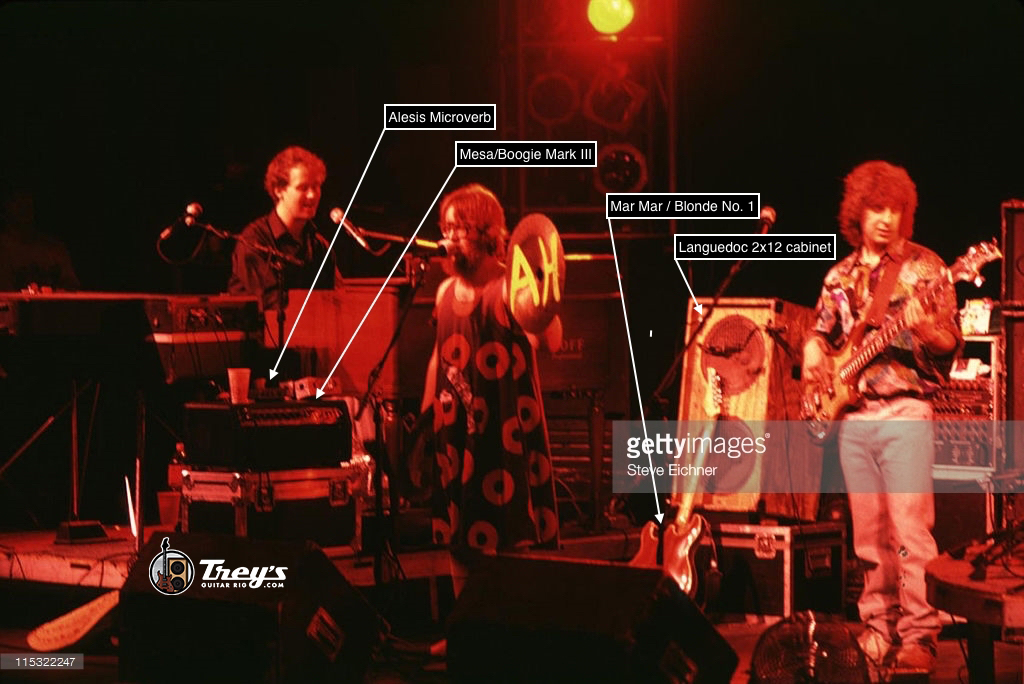 I’ve found two photos reliably dated 1992, one from Horde and another from Roseland. In both, Trey is using the Languedoc Blonde No. 1 (aka “Mar Mar”), the Mesa/Boogie Mark III head, and the 2×12 Languedoc cabinet. In the Roseland photo (3/14/1992), Trey has the Alesis Microverb sitting atop the Boogie. Photo credit to Getty Images and Steve Eichner.