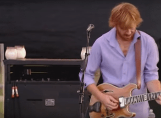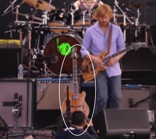 Circled in this photo is a big box Languedoc hollowbody that appeared very rarely on Phish tour. It appears to have a single humbucker. I don’t believe it was used during the festival.