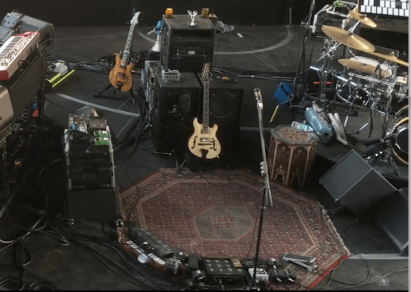 The photos below come from a video a friend of mine took from backstage at LOCKN’ during the changeover between sets, and also show pretty clearly that there’s no Mark III on stage. They give us great views of the 2×12 cabs, the floor array, the rack-top pedals and both guitars (the new Blonde No. 2 guitar is up front here, with Koa #1 set up toward the back).