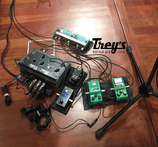 Floor/effects: TS-9 (more), TS-808 (less), Shin-Ei Uni-Vibe, CAE Boost/Line Driver, Walrus Audio Transit 3-loop bypass switcher. Note that the Uni-Vibe is in front of the Tube Screamers, whereas Trey usually runs the distortion first (Hendrix-style).