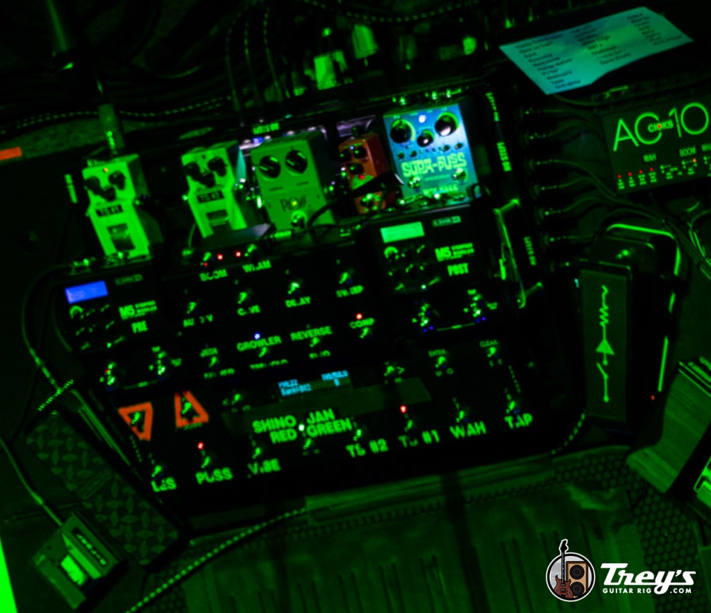 Here’s a great look at the beating heart of the pedal board from July 20. Across the bottom you can see switches for Leslie, Supa Puss, Nux Voodoo Vibe, two Tube Screamers, the Wah, and a universal tap tempo. Center bottom is an amp selector to choose between Shinobu and Jan Marie. In between the M5 unites, you can see the M5 presets available to select from, including Growler, Reverse, Delay, Sweep, Cave. There also appears to be a trigger for the Ross Compressor up there.