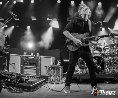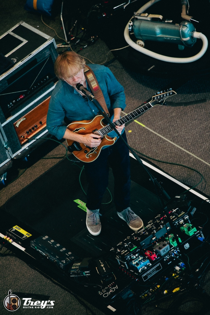 This beautiful shot from Mansfield night 2 gives us a full color look at the rig in its full glory. Note the use of a Cioks AC10 power supply. behind the CAE Wah and Digitech Whammy. The yellow and black box toward Trey’s rear right is a selector switch that allows him to choose to have his vocal mic audible to only the band or to the full audience.