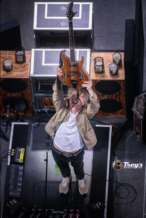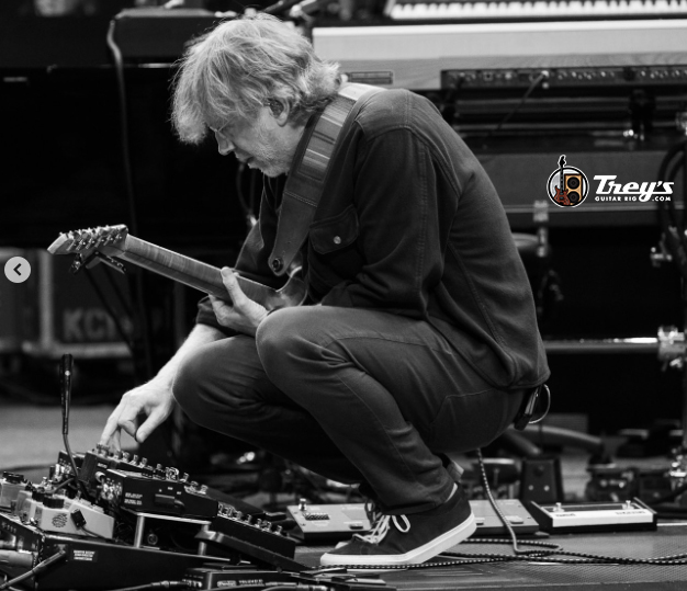 Amplifier choice moved around a bit in the early part of summer tour before Trey settled on one Trainwreck (Shinobu) and one Boogie.  A second Trainwreck, Tina, is currently used as backup.  Earlier in the tour, Jan Marie was loaded with 6v6 and run as a clean amp, while Shinobu was loaded with el-34.  The purple Komet 60 ran with 6L6 while in use.  The Boogie made its triumphant return in Connecticut on July 23, 2024.  It had otherwise not appeared on stage with Trey since Summer 2016, when it may have been backup.  The last time we can confidently say that it powered the rig was Summer 2015.   The Boogie lead channel is accessible by footswitch, so it is not being used exclusively for the clean tone.